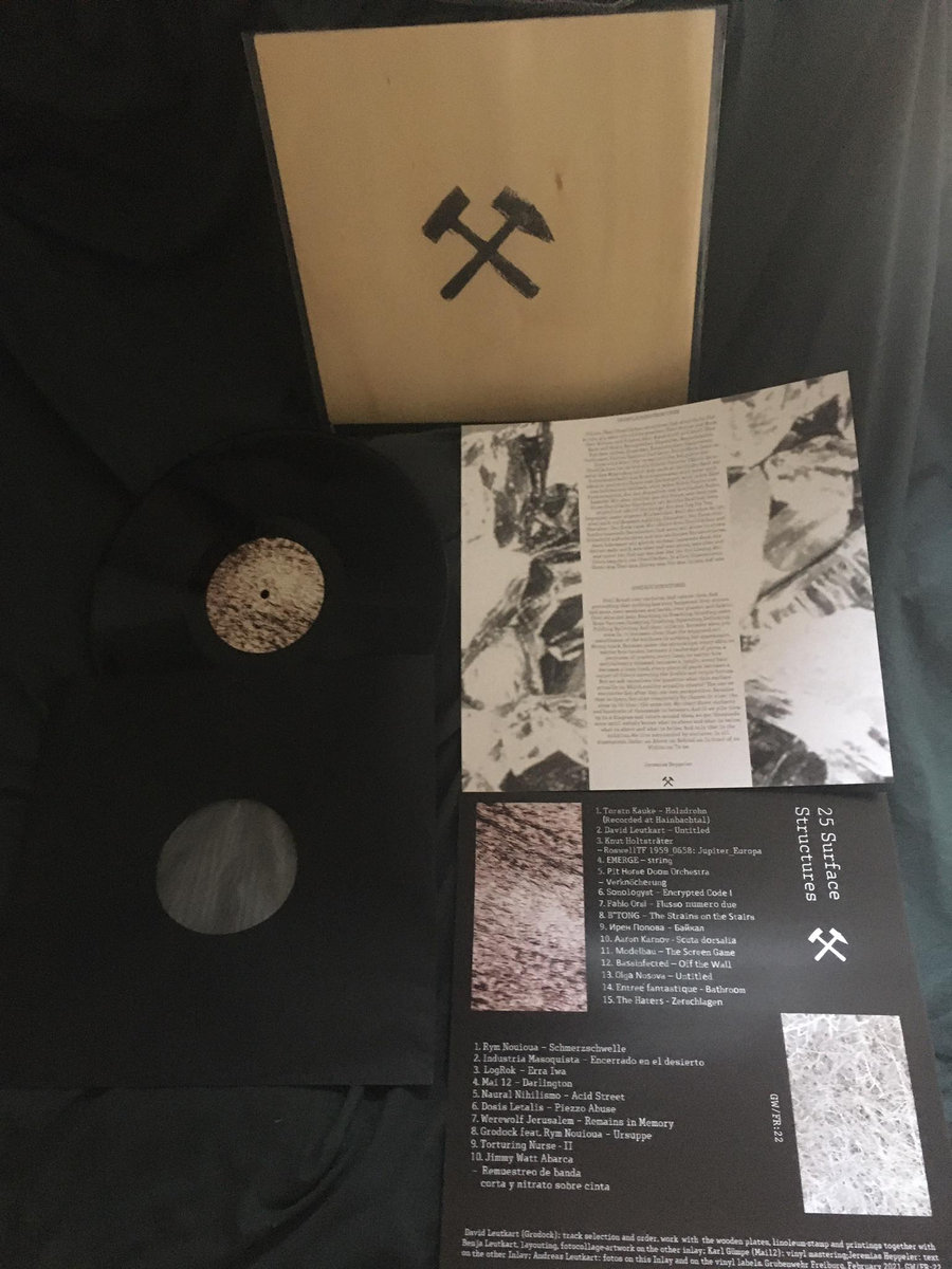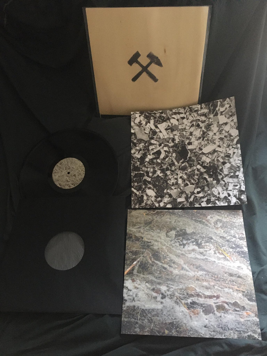 Each of the releases comes with a differently grained wooden plate, hand-printed with a linoleum stamp and two inlays with photo art by Andreas and David Leutkart and a Poem by Jeremias Heppeler. the photographs and photo collages of various surface structures